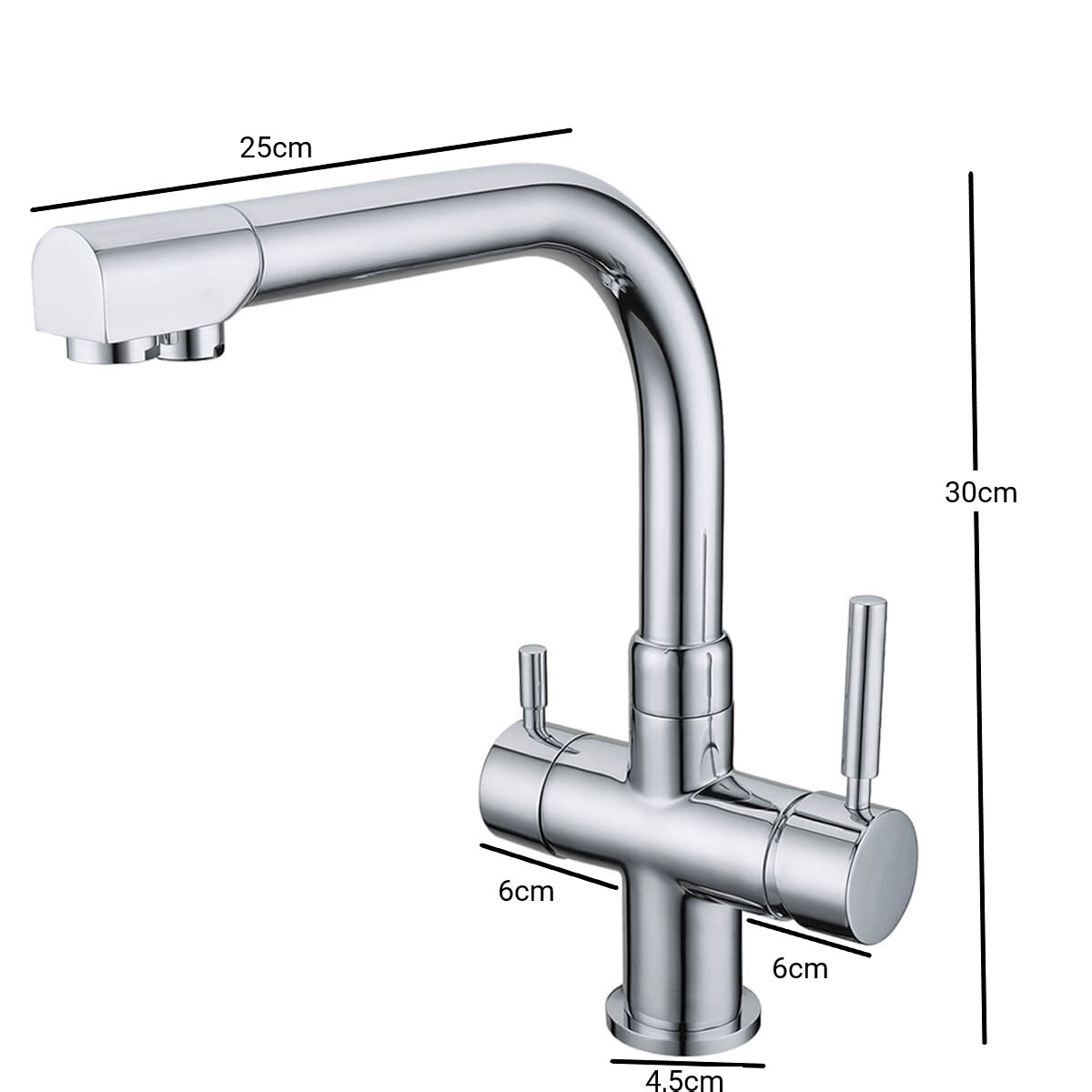 - Bei einer 3-Wege-Armatur sind zwei separate, innenliegende Leitungen verbaut. Die Hauptleitung versorgt den Hahn mit Warm- und Kaltwasser, die über ein Keramikventil in der Mischbatterie auf die gewünschte Temperatur eingestellt werden. In der zweiten Leitung fließt das Osmosewasser, das direkt mit der Osmoseanlage verbunden ist und nicht mit dem normalen Leitungswasser in Berührung kommt. Diese getrennten Leitungen garantieren, dass das Osmosewasser immer rein bleibt.
