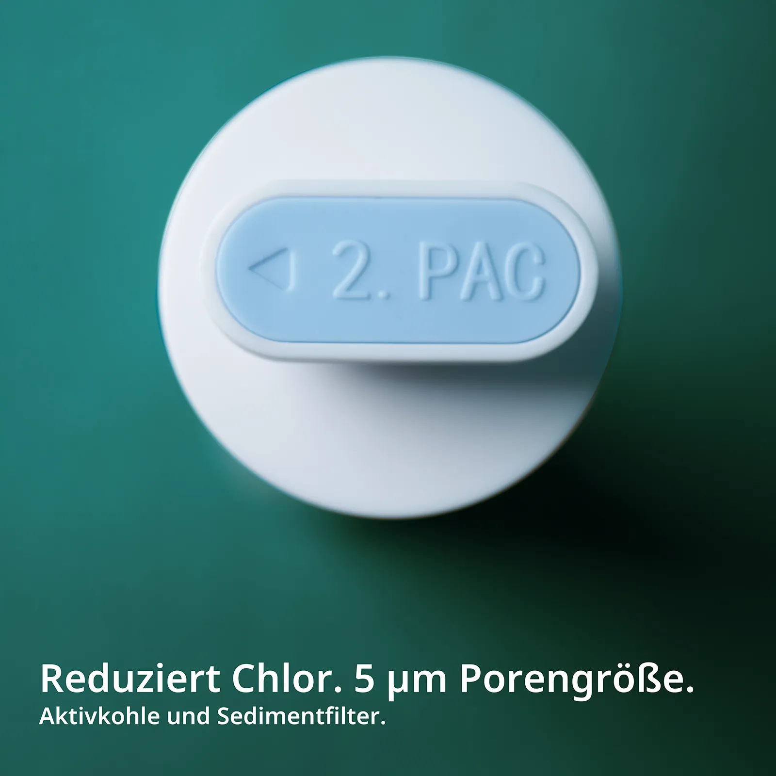 Im ersten Schritt entfernt der Sedimentfilter grobe Partikel wie Sand oder Rost. Danach wird das Wasser durch einen hochwertigen Aktivkohleblock geleitet, der effektiv Chlor, Geruchs- und Geschmacksstoffe sowie weitere unerwünschte Verbindungen reduziert. Zum Schluss schützt das integrierte ScaleShield die Membran zuverlässig vor Kalkablagerungen und anderen ungeladenen Stoffen wie Phenolen oder Benzolen.
