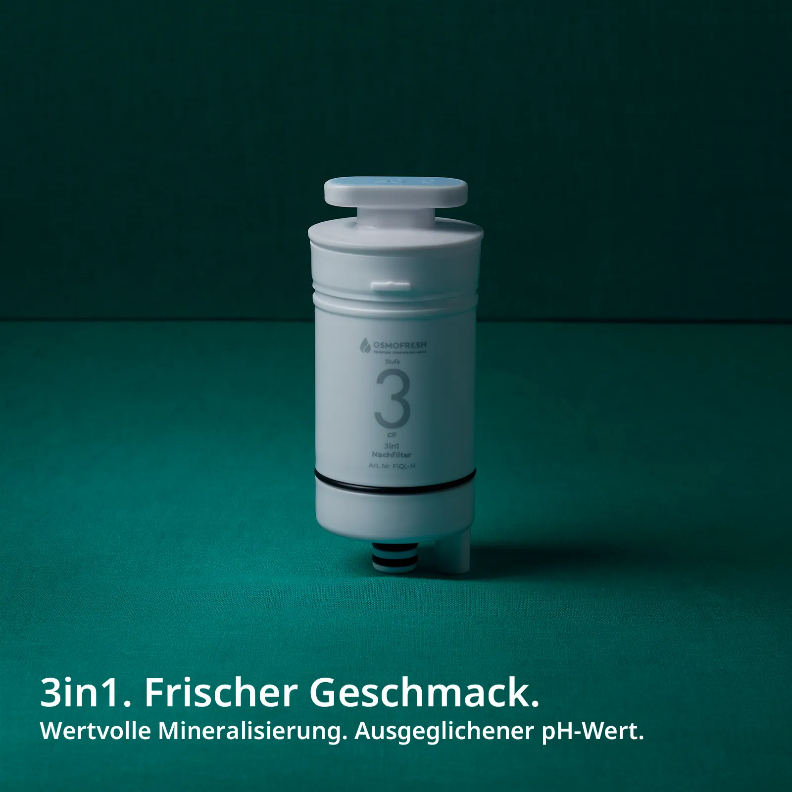 Im letzten Schritt wird das Wasser nochmals durch einen 3in1 Mineral-Nachfilter geleitet, um das wunderbare Geschmackserlebnis zu erzeugen. Alle diese Filter sind einfach und schnell einzubauen, bzw. zu wechseln. Eine detaillierte Beschreibung zum Filterwechsel finden Sie in Ihrer Einbauanleitung.