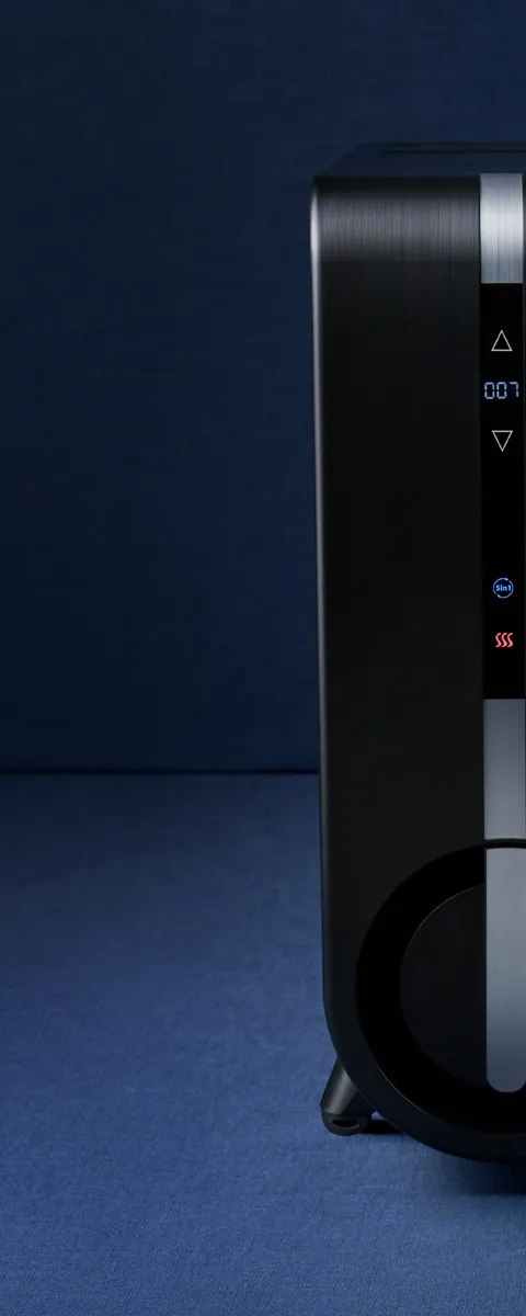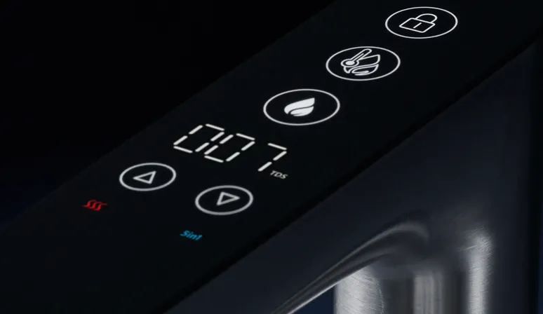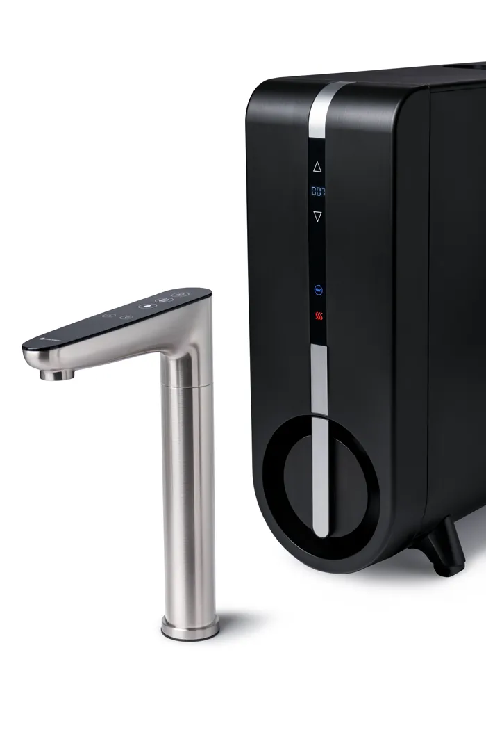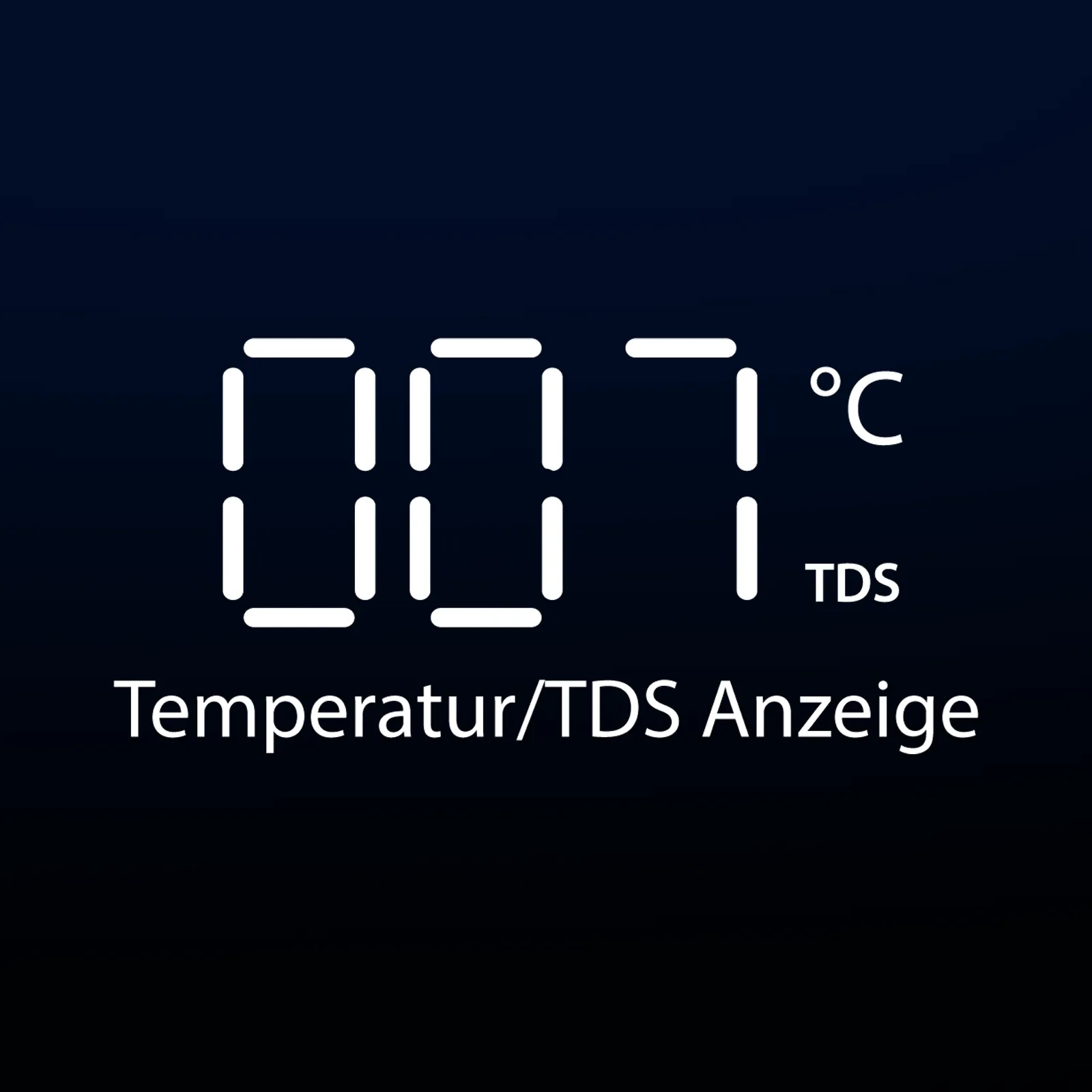 Denn das Herzstück der Anlage ist der smarte FlowTouch Wasserhahn, der dir in Echtzeit die aktuelle Temperatur und Wasserqualität anzeigt. Per Touch steuerst du die Wasserausgabe – bis zu 1,8 L/min., sicher durch Kindersicherung, und so komfortabel wie nie.