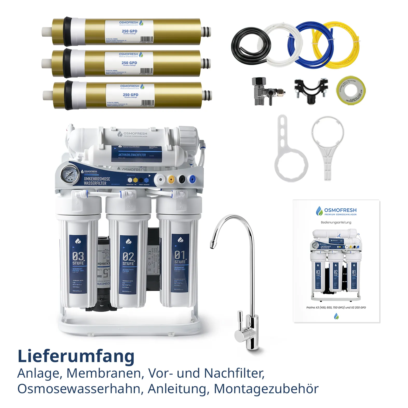 Mit der Proline X3 750 bietet OsmoFresh eine spezielle Osmoseanage für Wasserfiltration im professionellen Bereich an. Die Proline X3 750 basiert dabei auf der neuen X3-Plattform mit robusteren Komponenten und dem bewährten 5-stufigen Filtersystem. Zusätzlich ermöglicht die verstärkte Hochleistungs-Pumpe längere Einsätze und mehr Leistung für bis zu 110 L/Stunde!