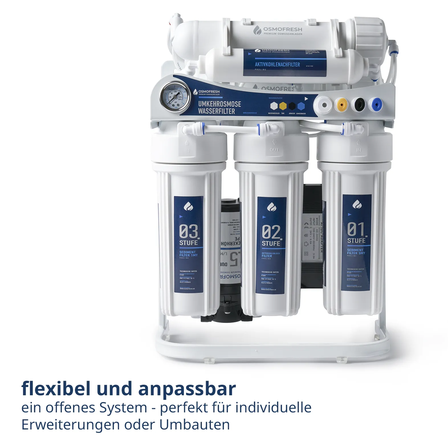 Die X3-Plattform kam erstmals bei der Proline 600 zum Einsatz und wurde speziell für mehr Sicherheit bei unseren Wasserfiltern entwickelt. Die Filter- und Membrangehäuse sind verstärkt und doppelt abgedichtet und halten einem Druck bis zu 20 Bar stand! Die Filtergewinde wurden nach innen verlegt um ein "Abspringen" der Filtergehäuse bei hohem Druck zu vermeiden. Zusätzlich sind die Anschlüsse, wie bei OsmosFresh gewohnt, ordentlich nebeneinander an der Front angeordnet. Für einen einfacheren und praktischeren Anschluss der Osmoseanlage. Die Proline X3 750 ist außerdem mit einem Druckmanometer ausgestattet, für noch mehr Kontrolle!