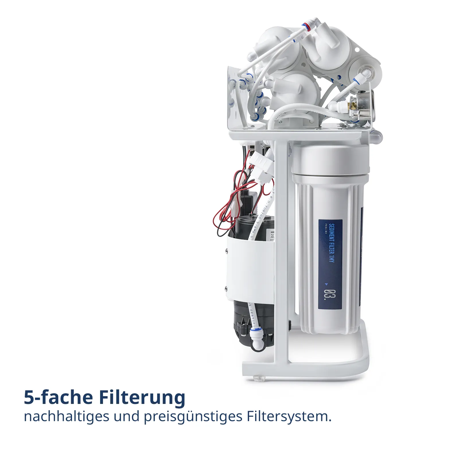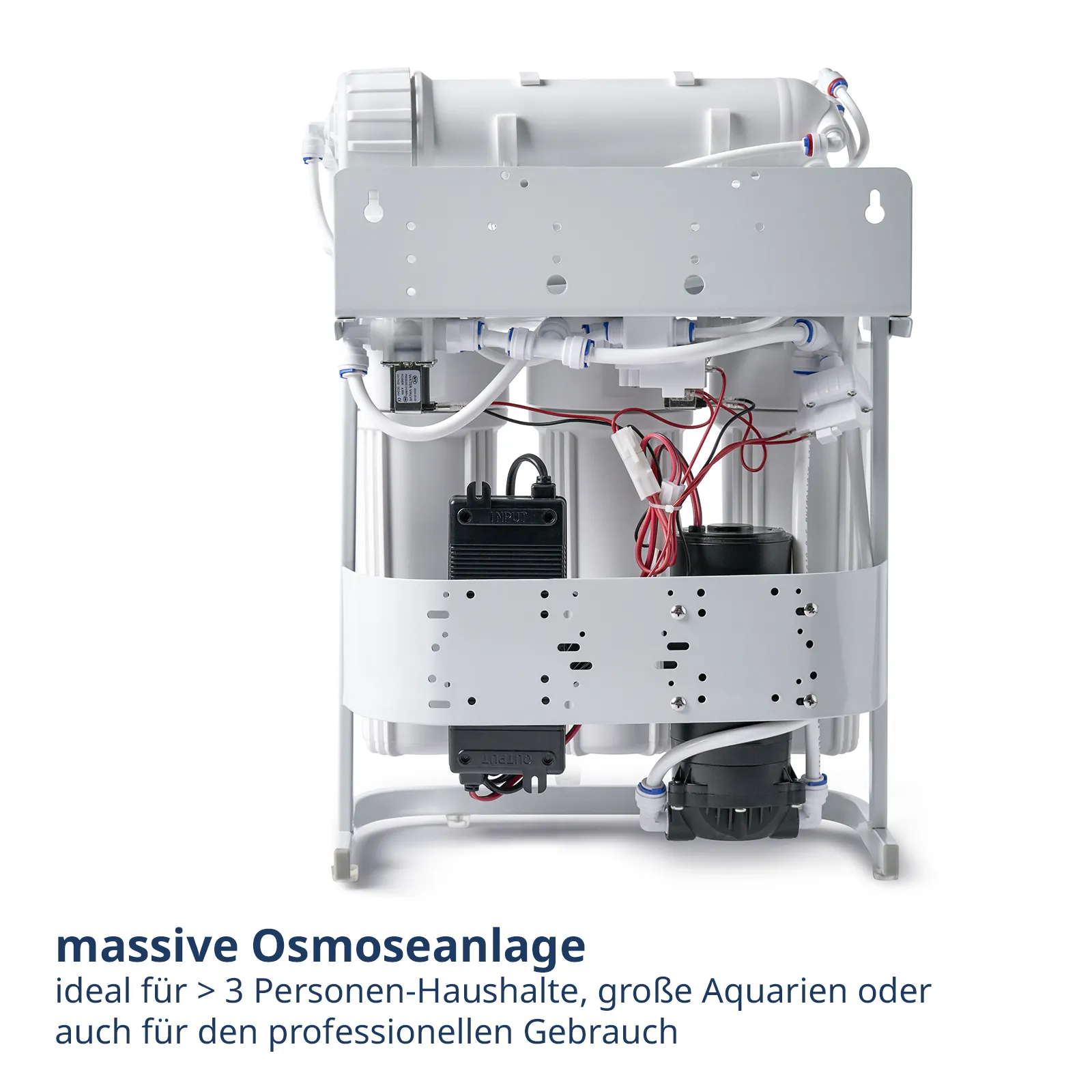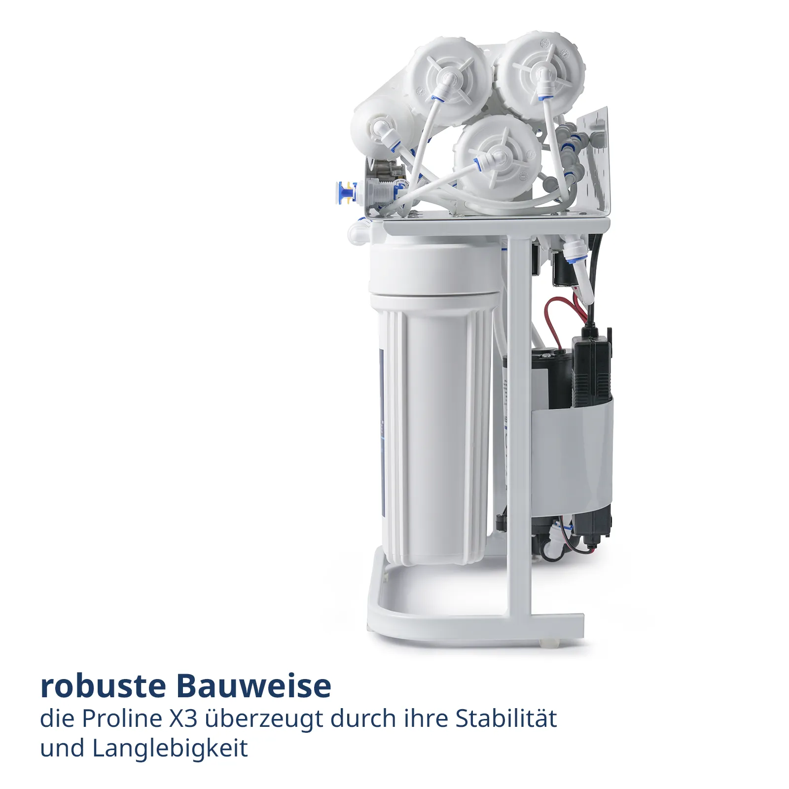 Bei der Proline X3 750 wurde speziell bei der Technik viel Hand angelegt. Alle Komponenten sind für lange Einsätze und ein hartes Umfeld konzipiert. Seien es die extradicken Filter - und Membrangehäuse oder das verschweißte Stahlgestell, Standfestigkeit und Zuverlässigkeit waren oberstes Gebot bei der Entwicklung. Ein besonderes Augenmerk liegt dabei auf der robusten Hochleistungs-Pumpe für lange Einsatzzeiten und ohne Wartungsintervalle. Sie erhöht die Effizienz und Geschwindigkeit der Proline X3 750 durch einen optimalen Betriebsdruck der in Echtzeit auf dem Manometer abgelesen werden kann. Zusätzlich ist die Proline X3 750 mit einem manuellem Spülventil ausgestattet. Damit spült sich die Osmoseanlage vor und nach jedem Gebrauch automatisch und erhöht damit die Wasserqualität und Lebensdauer der Filter!