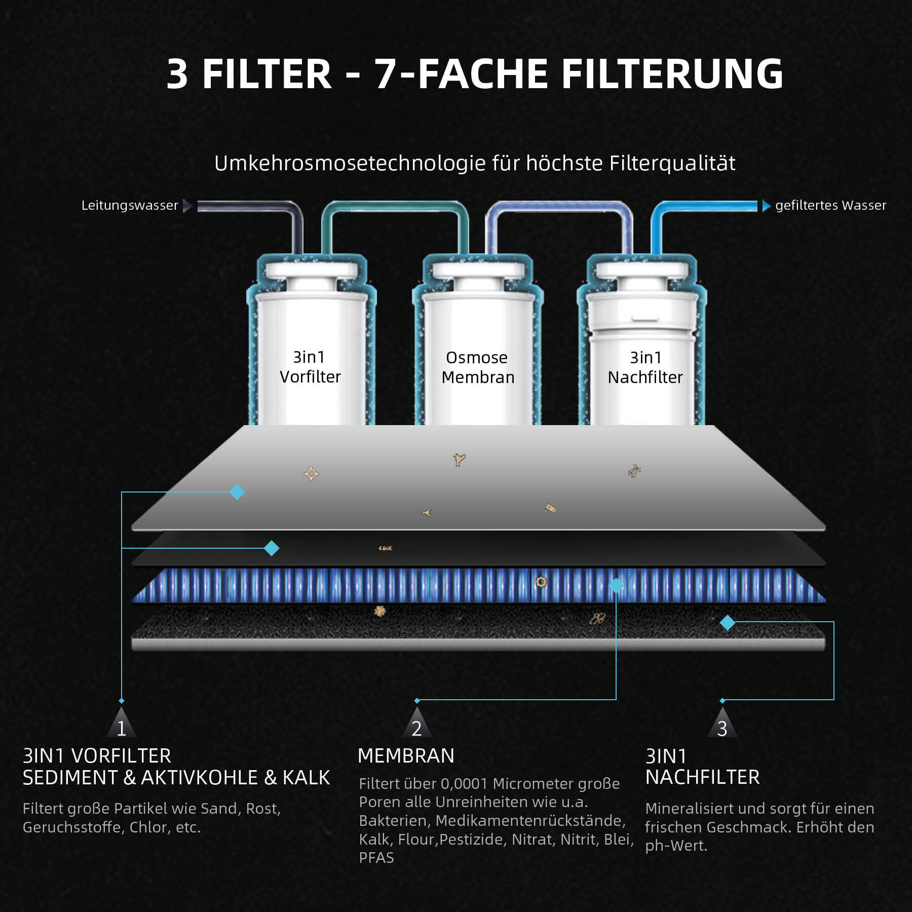 - Filterstufen: 7-stufig (3in1 Vorfilter, Membran, 3in1 Mineralisierungsfilter)