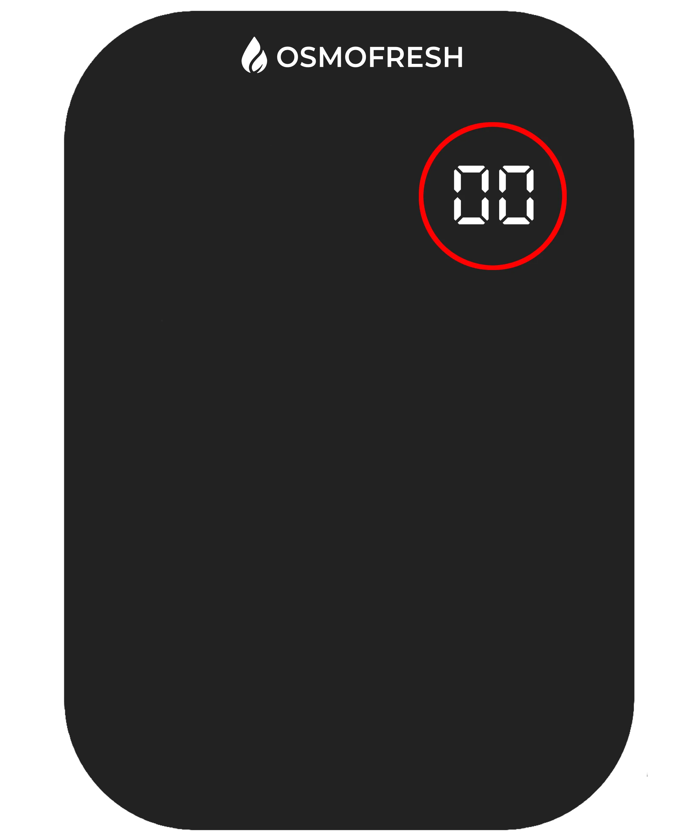 • Das Display sollte „00“ oben rechts anzeigen und aus dem Wasserauslass sollte Wasser herauslaufen. Nach etwa 4 Minuten wechselt das Display wieder auf sein normales Erscheinungsbild und das Wasser hört auf aus dem Gerät zu laufen