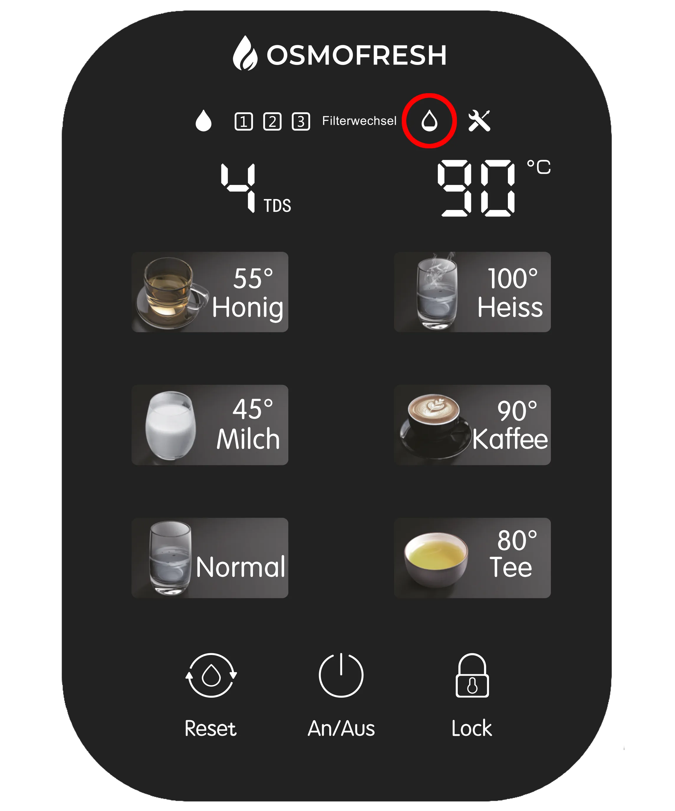 Der weiße Tropfen bedeutet, dass das Gerät derzeit filtert. Wenn der weiße Tropfen blinkt kann während des Filterprozesses kein Wasser entnommen werden. Leuchtet der weiße Tropfen durchgehend, kann in der täglichen Nutzung jederzeit Wasser entnommen werden.