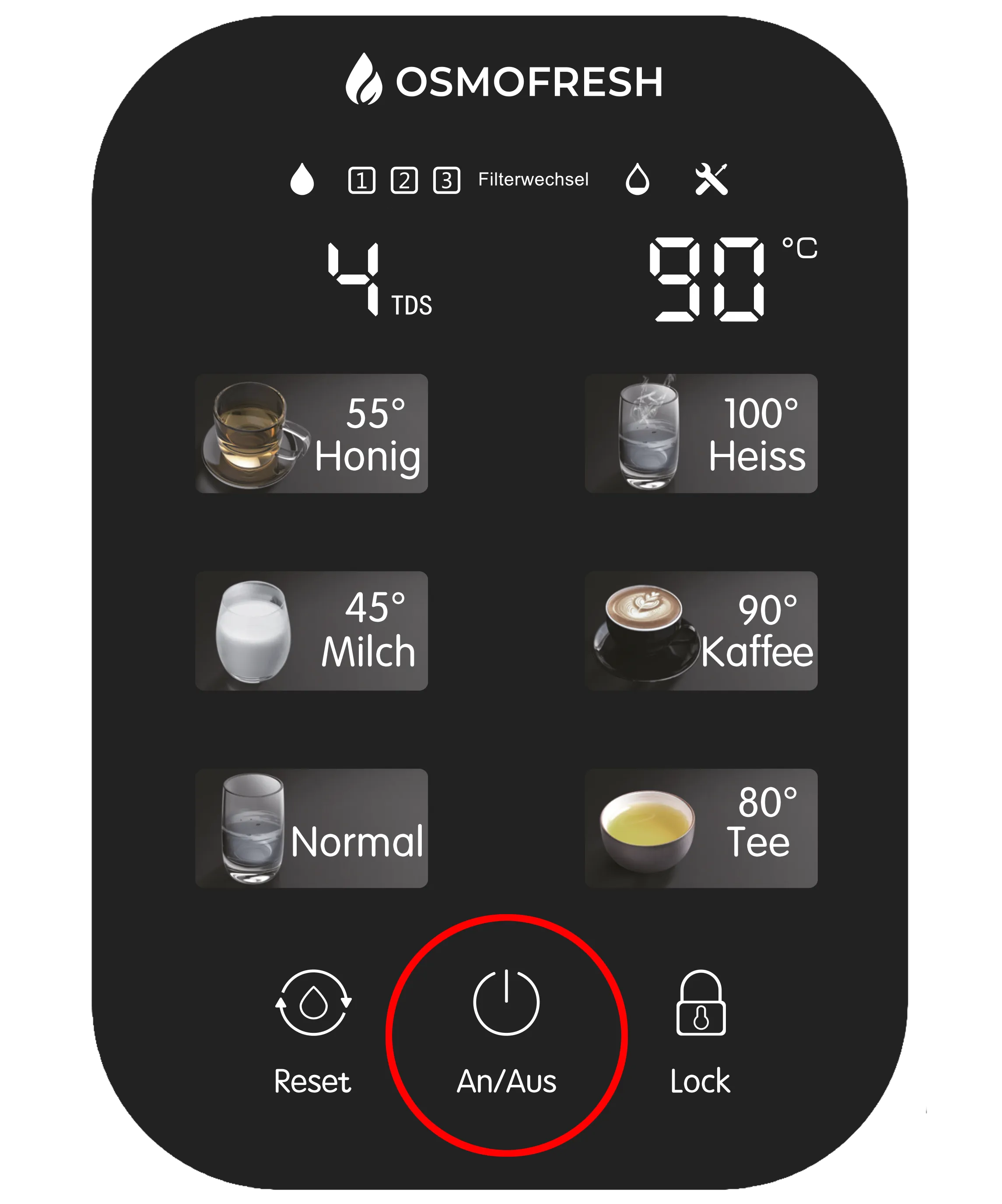 Das soeben durchgeführte „Spülen“ ist wichtig, um die Membran und die Filter einzufahren, damit sie ihre volle Filterleistung entfalten können. Im Verlauf dieses Prozesses sollte auch der auf dem Display angezeigte TDS-Wert von ca. 30 auf einen Wert zwischen 2 und 20 fallen.