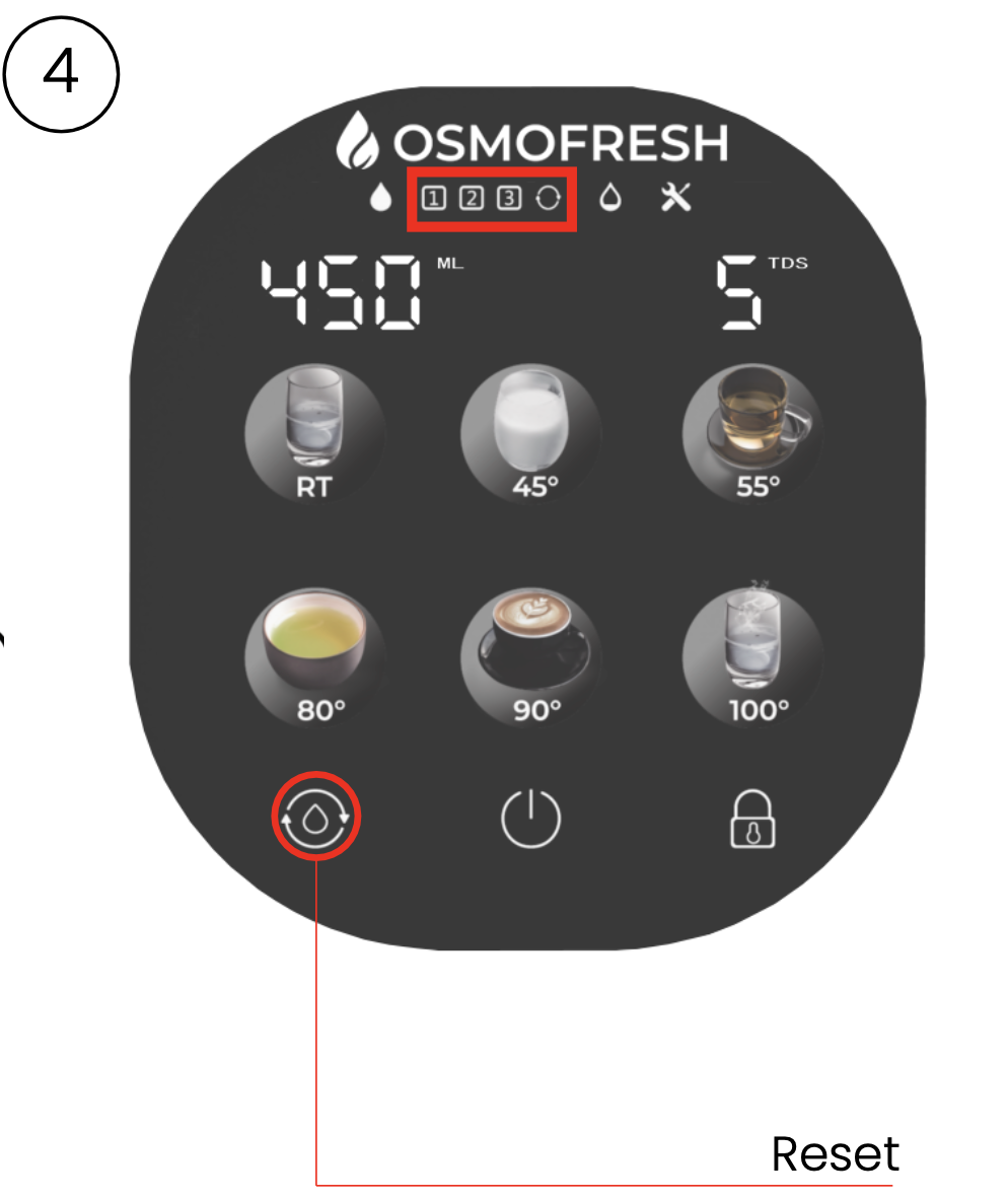 Wenn der Filter etwa 10% seiner Restlebensdauer erreicht hat, so leuchtet das jeweilige Filterwechselelement (1, 2 oder 3) auf dem Display rot. Dies ist das Zeichen, dass möglichst bald der jeweilige Filter gewechselt werden sollte. In manchen Fällen kann es sein, dass die Filterwechselanzeige länger oder kürzer benötigt als angegeben, um einen Filterwechsel anzuzeigen. Dies hat damit zu tun, dass unsere interne Steuerung die Uhrzeit bzw. das Datum nicht kennt. Daher messen wir die Pumpenlaufzeit als Indikator für den Filterwechselzyklus. Dafür müssen wir jedoch Annahmen zur Nutzung des Gerätes treffen. Falls Ihr persönliches Nutzungsverhalten davon abweicht, so empfehlen wir den Wechselzyklus individuell zu überwachen. Bei der Membran empfehlen wir einen Wechsel, wenn der angezeigte TDS-Wert dauerhaft über 30 liegt. Entsprechende zeitbasierte Einträge für Ihren Kalender im Handy können Sie hier herunterladen: