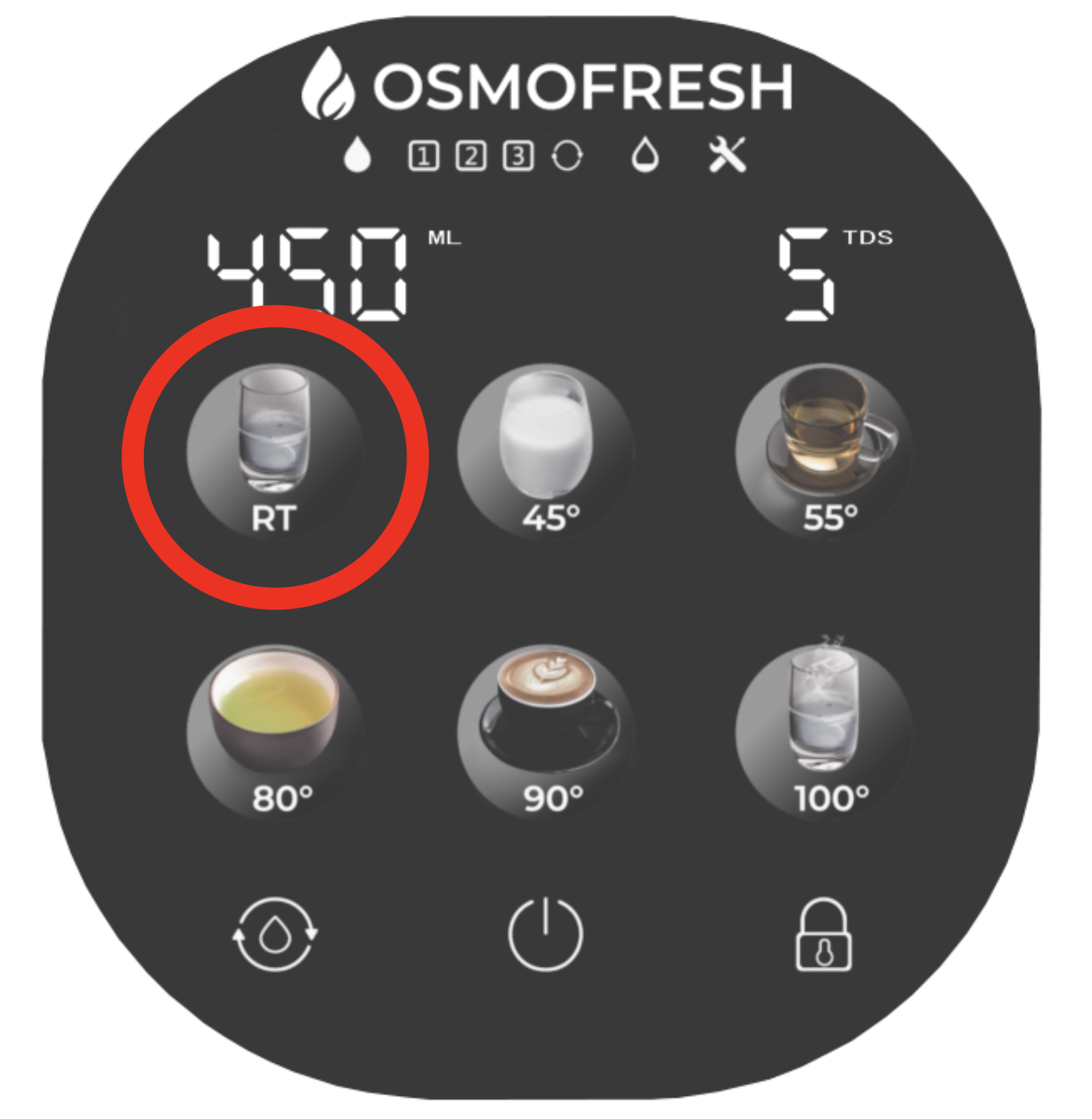 • Drücken Sie dazu auf den Button „RT“ (für Raumtemperatur) auf dem Display und halten Sie ein Glas unter den Wasserauslass.