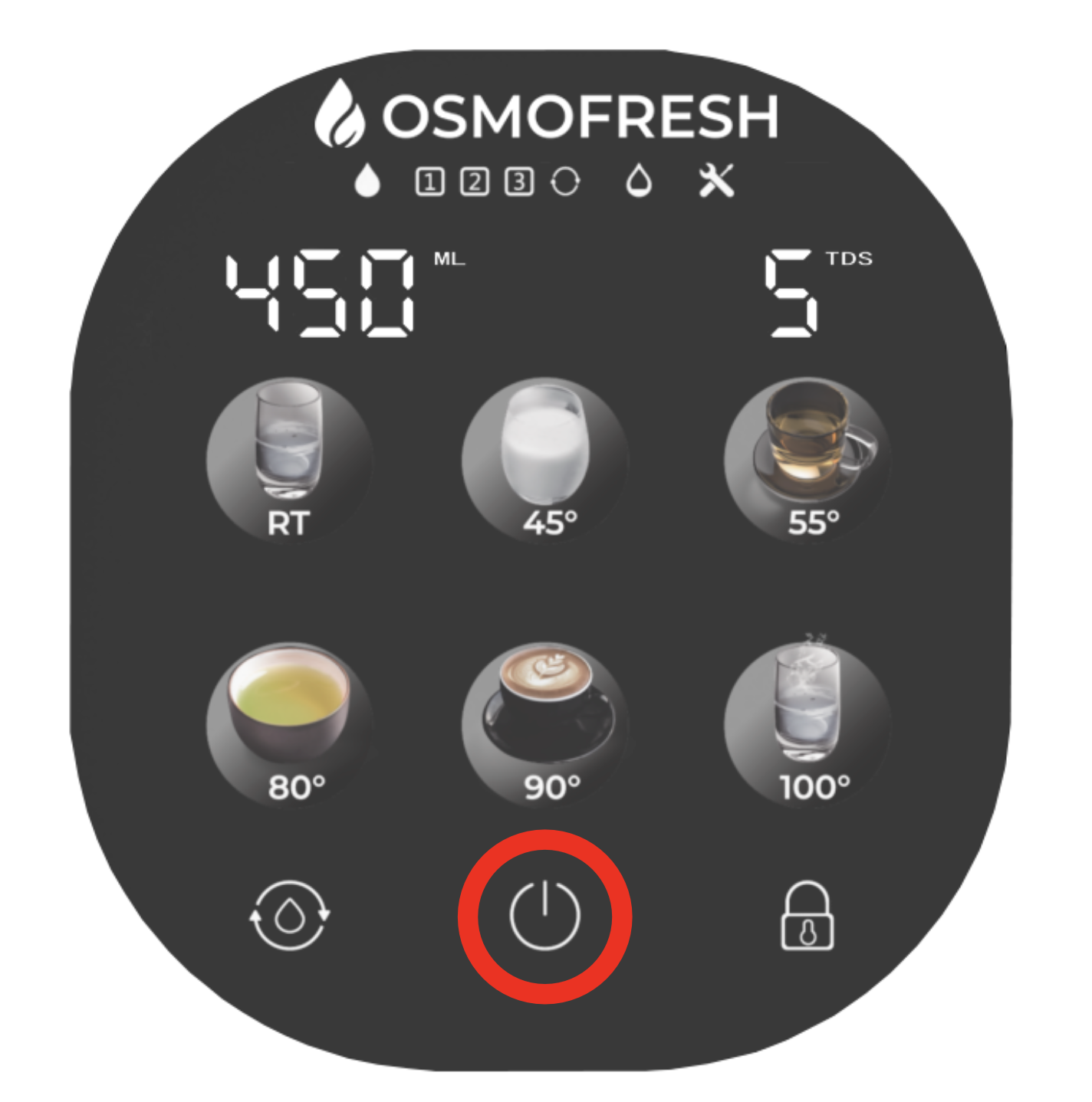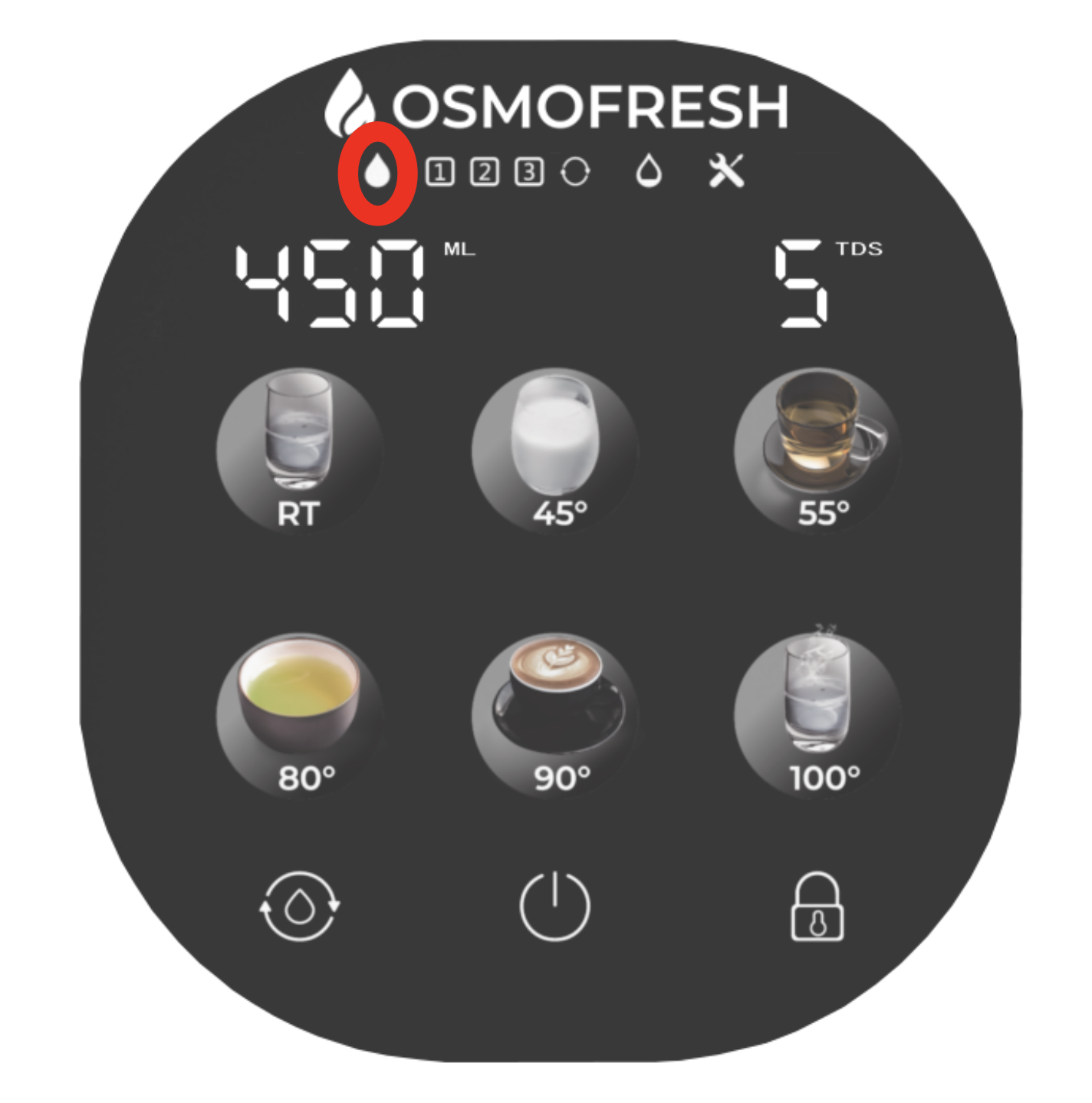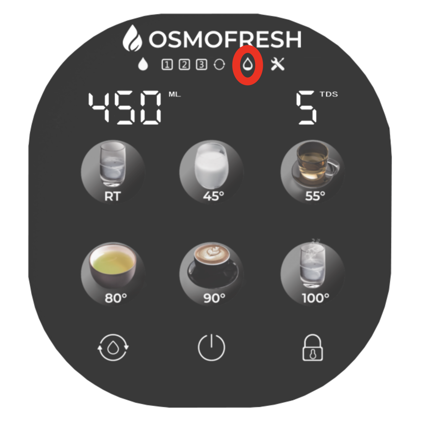 Das soeben durchgeführte „Spülen“ ist wichtig, um die Membran und die Filter einzufahren, damit sie ihre volle Filterleistung entfalten können. Im Verlauf dieses Prozesses sollte auch der auf dem Display angezeigte TDS-Wert von ca. 30 auf einen Wert zwischen 2 und 20 fallen.