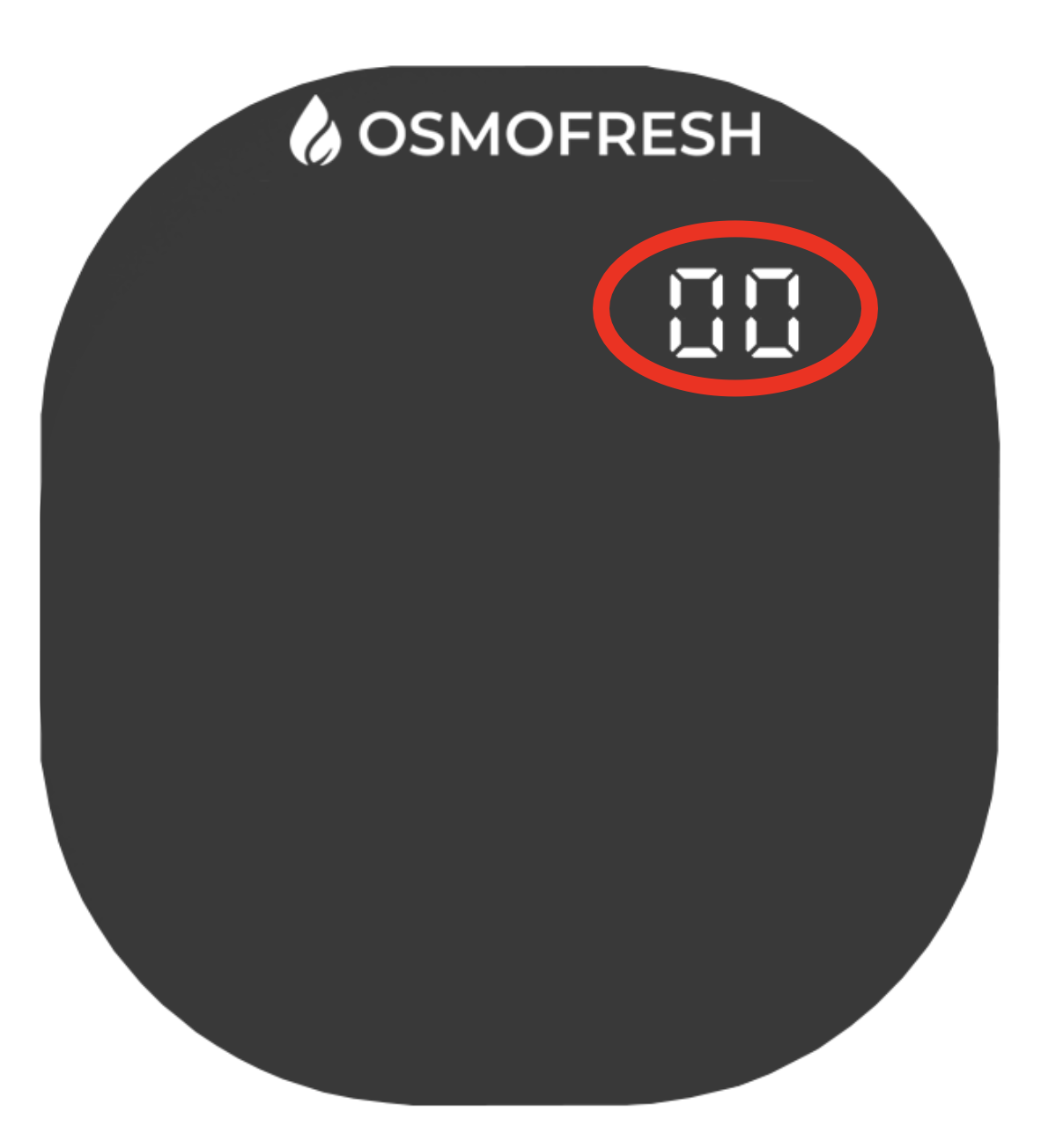 • Das Display sollte „00“ oben rechts anzeigen und aus dem Wasserauslass sollte Wasser herauslaufen. Nach etwa 4 Minuten wechselt das Display wieder auf sein normales Erscheinungsbild und das Wasser hört auf aus dem Gerät zu laufen