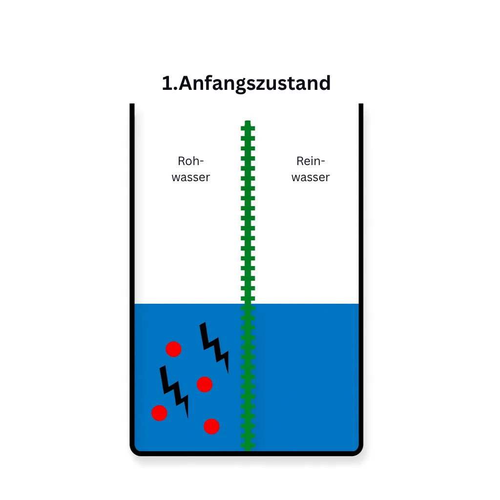 - Unser Beispielgefäß ist in der Mitte durch eine Membran getrennt. Diese Membran ist so beschaffen, dass sie nur Wassermoleküle, d.h. Wasser in seiner reinsten Form, durchlässt. Auf der linken Seite befindet sich das Roh- oder Leitungswasser, welches Verunreinigungen wie z.B. Salze enthält. Auf der rechten Seite haben wir reines Osmosewasser hineingefüllt.