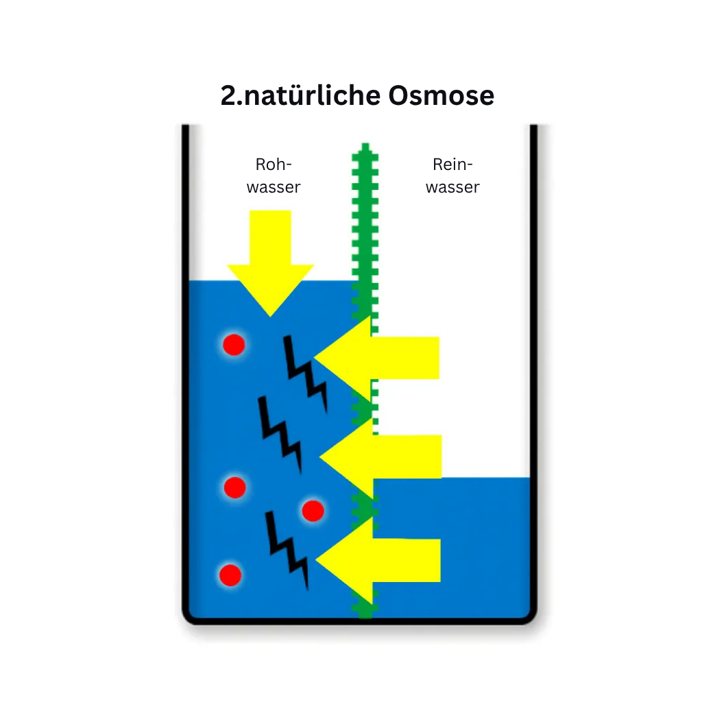 - Unter normalen Umständen würde nun das Osmosewasser durch den osmotischen Prozess durch die Membran in den Bereich des Rohwassers gelangen. Dies liegt daran, dass der osmotische Druck des Rohwassers deutlich höher ist. Einfach gesagt, zieht das Salz das reine Wasser an. Wäre das Gefäß geschlossen, wäre nun der Druck auf der Rohwasserseite deutlich höher als auf der Reinwasserseite.